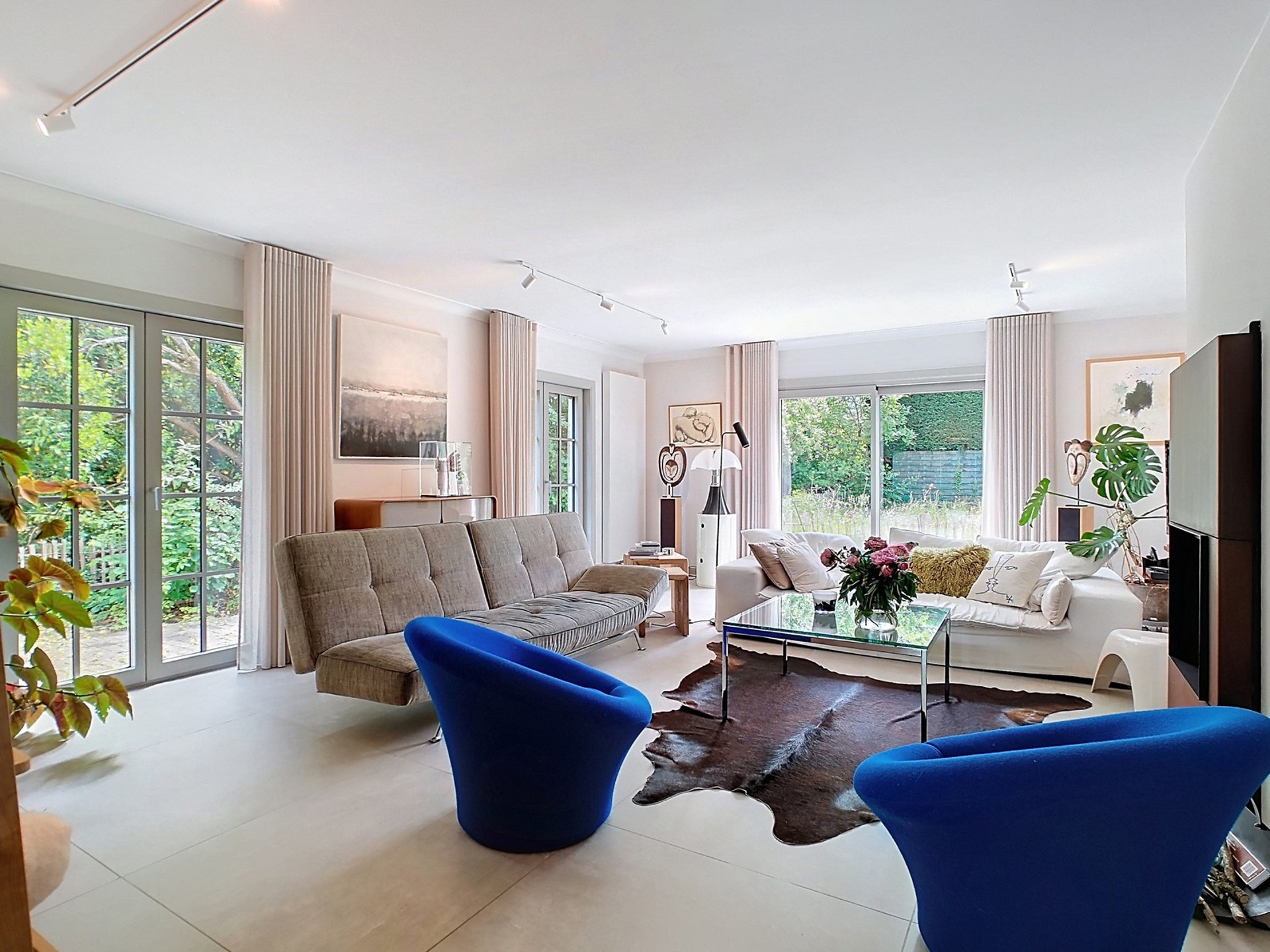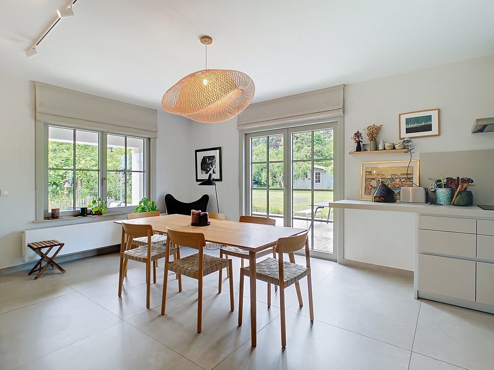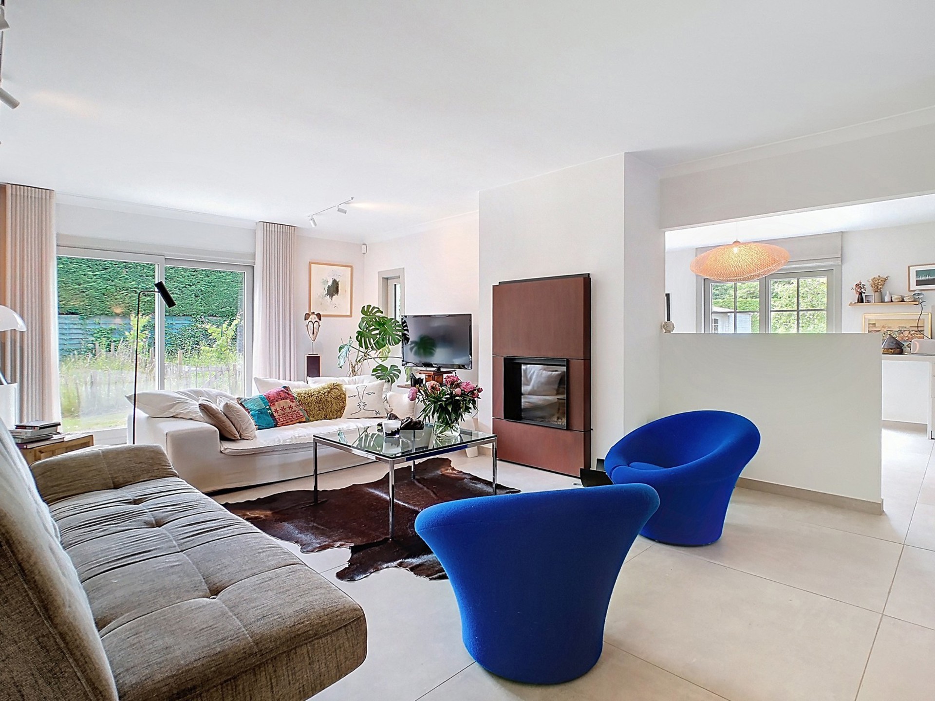 Séjour de 60 m² (dallage) avec accès au jardin, comprenant un agréable salon de 38 m² avec feu ouvert à cassette (STÛV) et une salle à manger de 22 m².