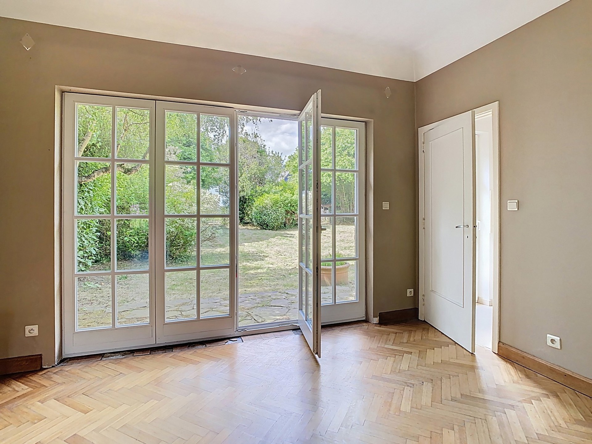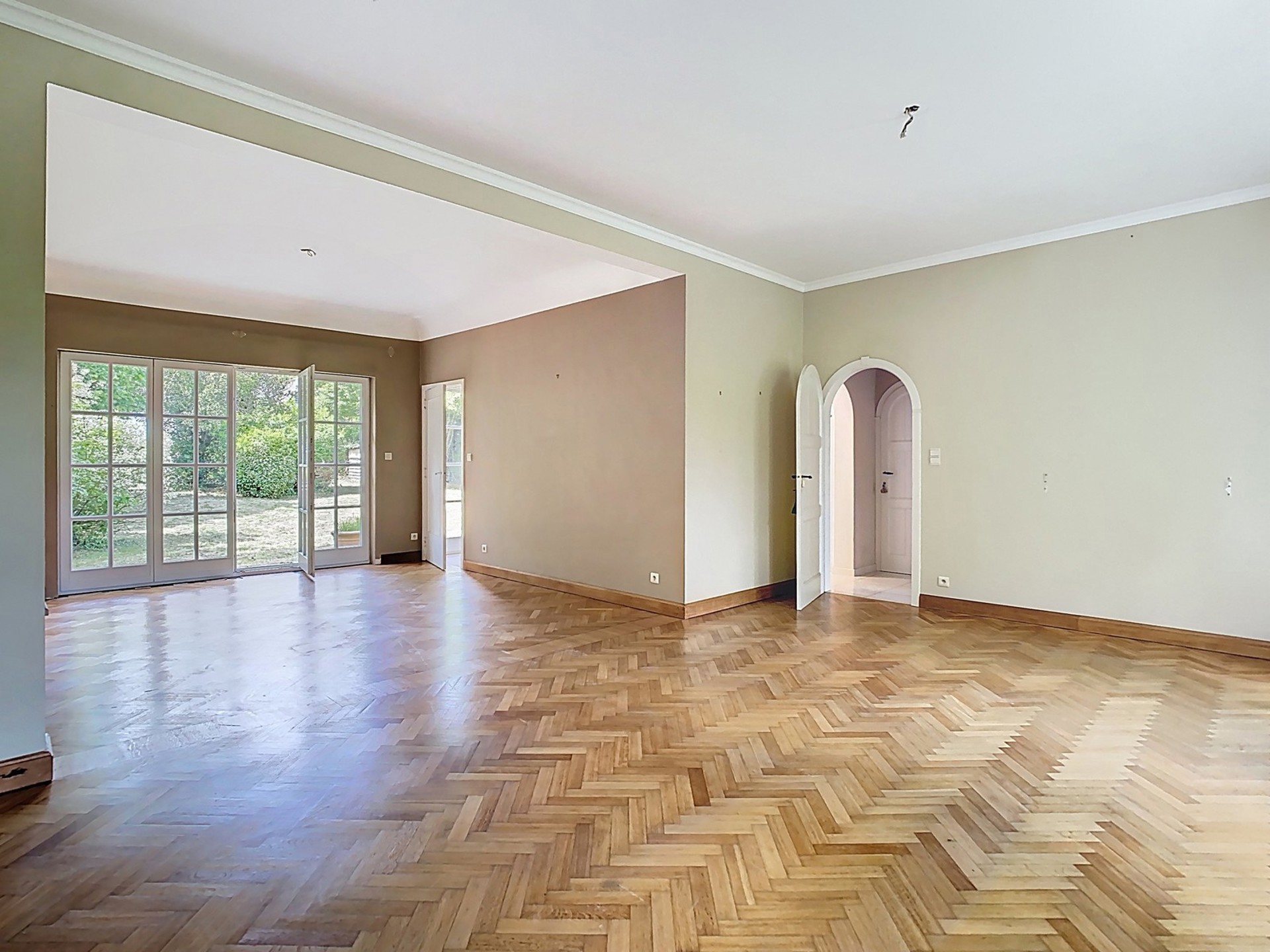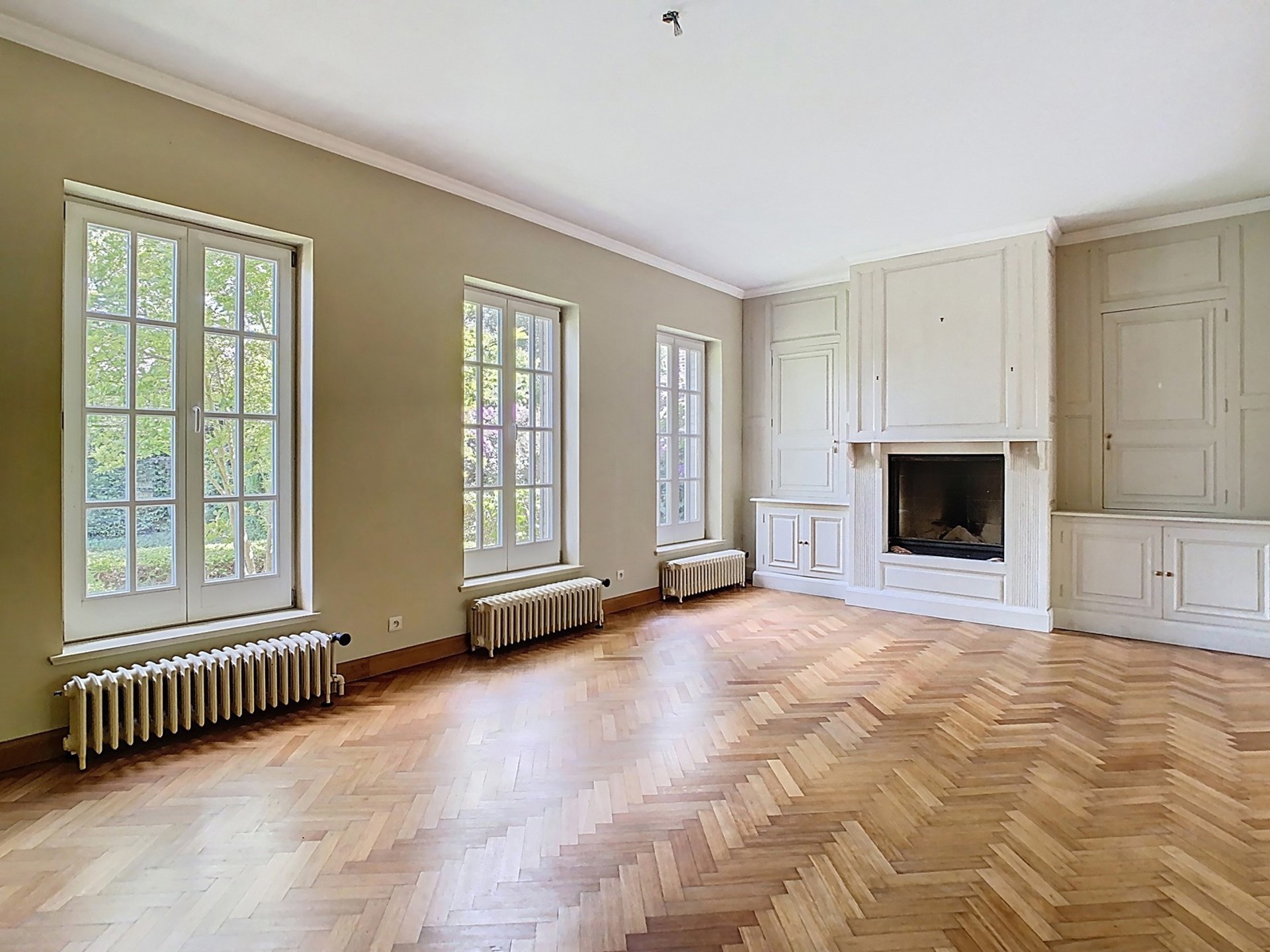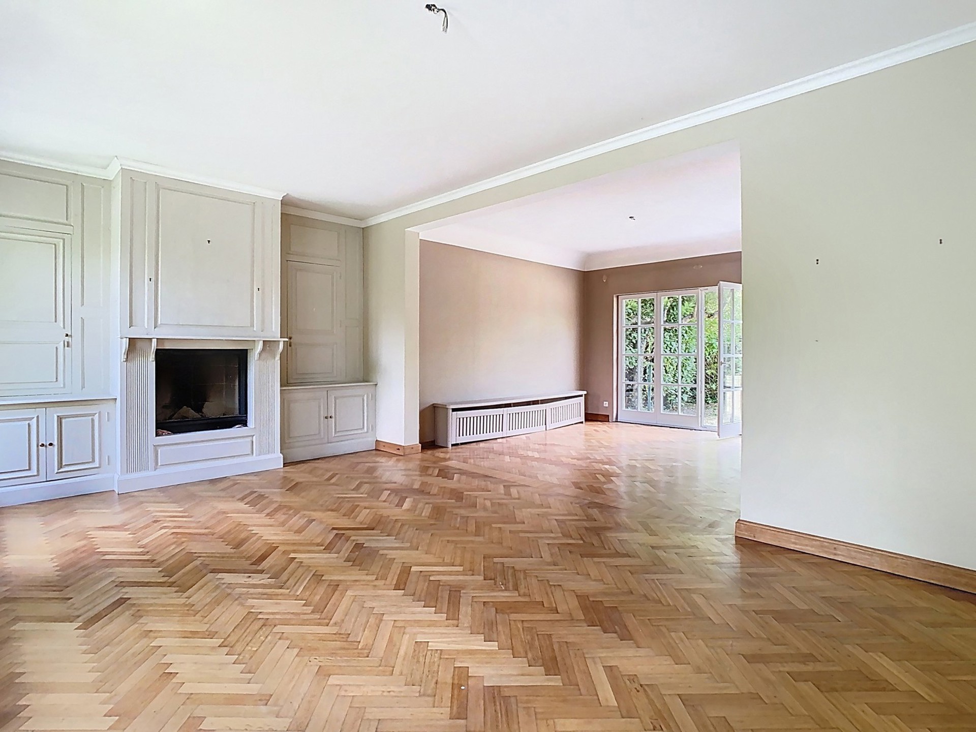 Séjour agréable et lumineux de 43 m² (parquet à chevrons) avec feu ouvert à cassette, placards intégrés de part et d’autre du feu ouvert et accès vers le jardin.