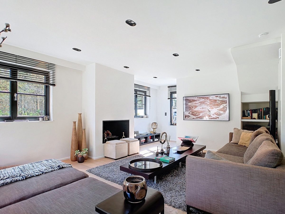 Séjour en L de 44 m², lumineux et spacieux, agrémenté d’un feu ouvert ainsi que d’un accès à la terrasse et au jardin.