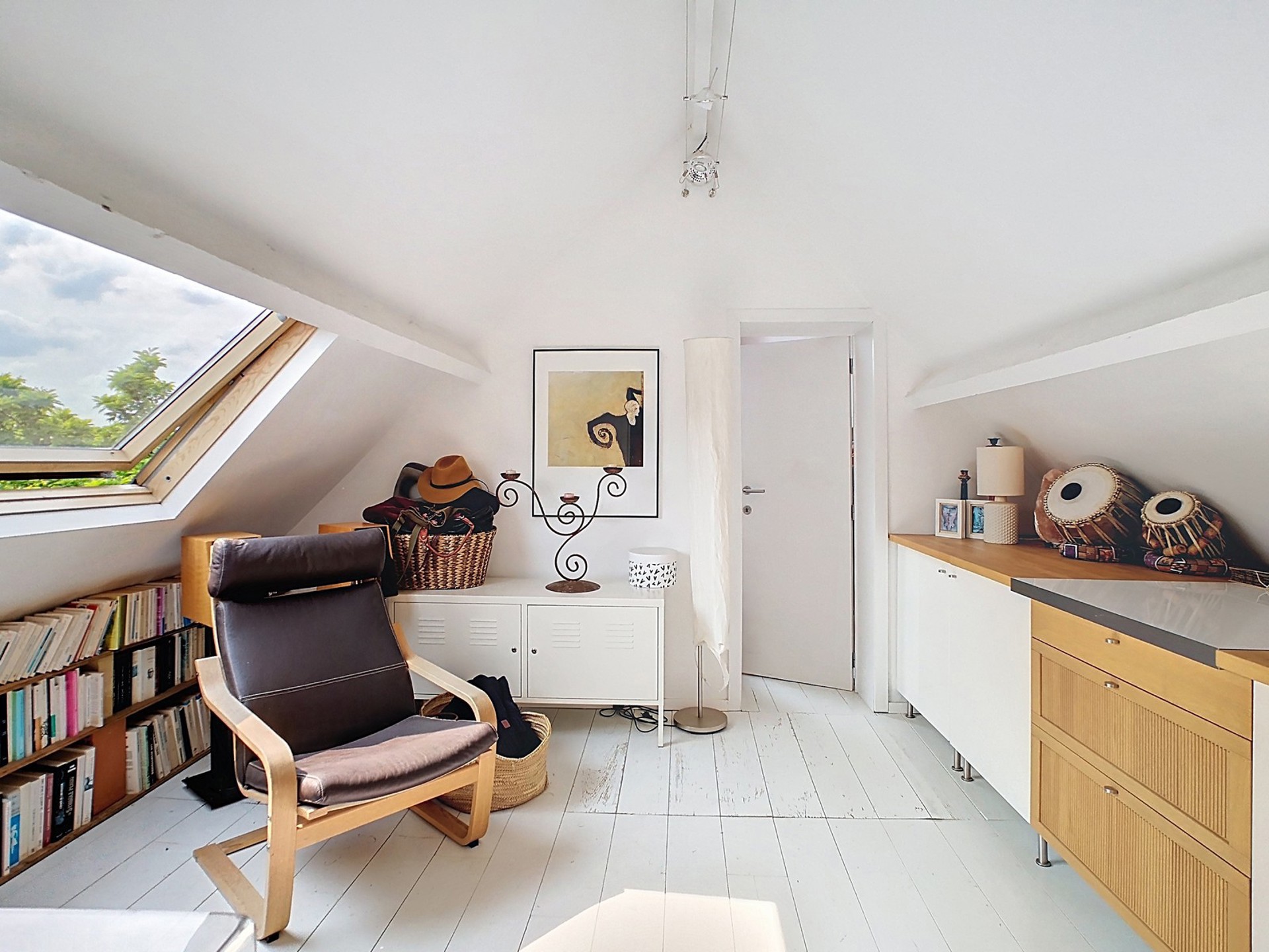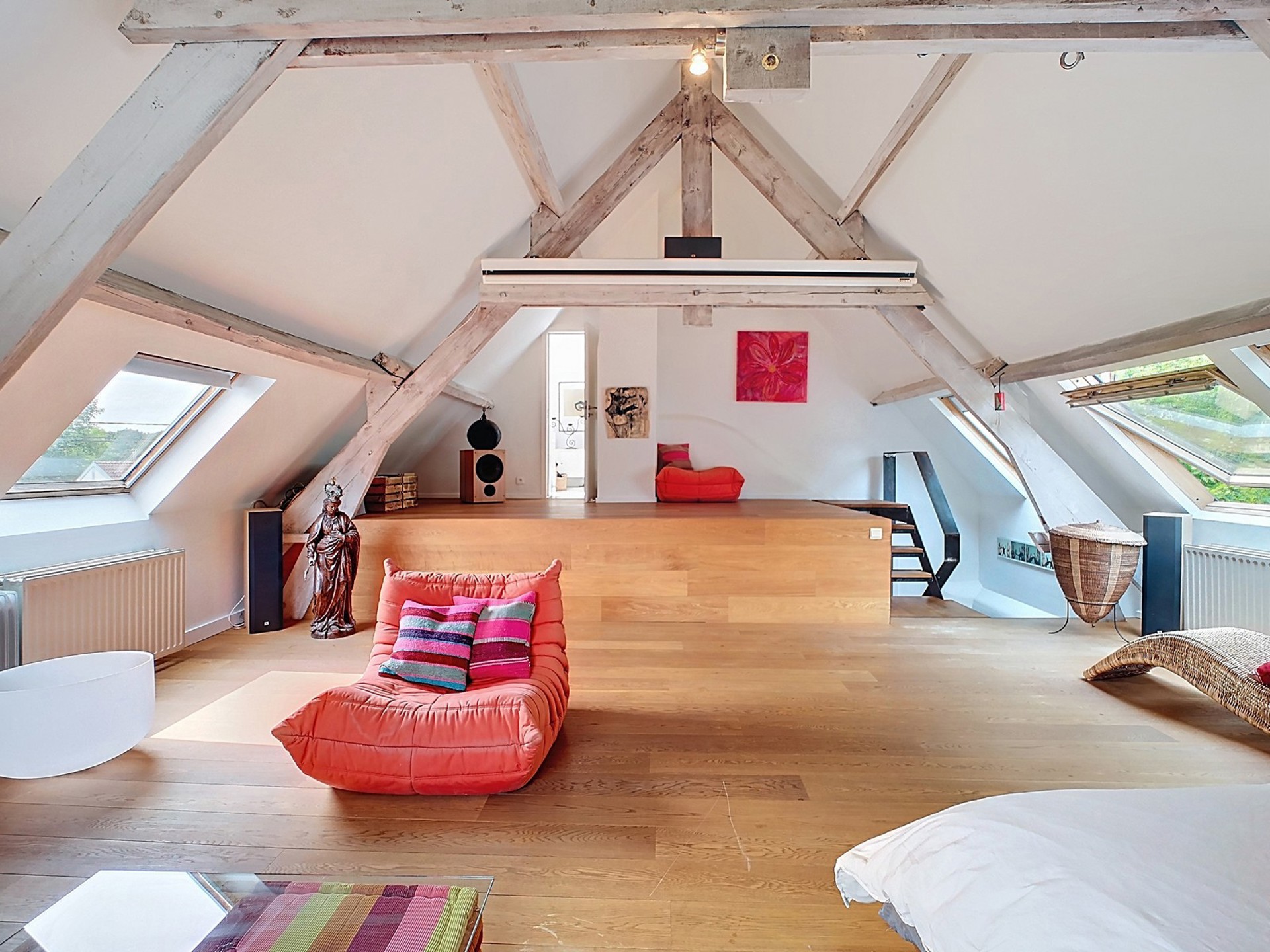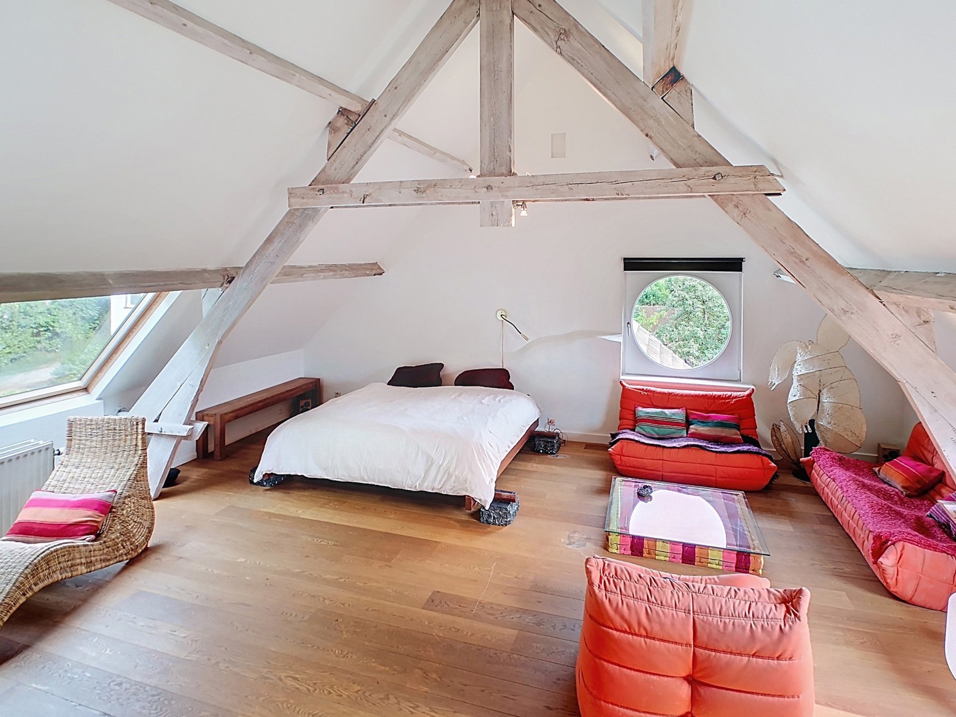 Chambre 5 parentale de 45 m², vaste et lumineuse avec coin salon, grande mezzanine et belle vue sur les abords (présence de 4 velux + grande fenêtre hublot).