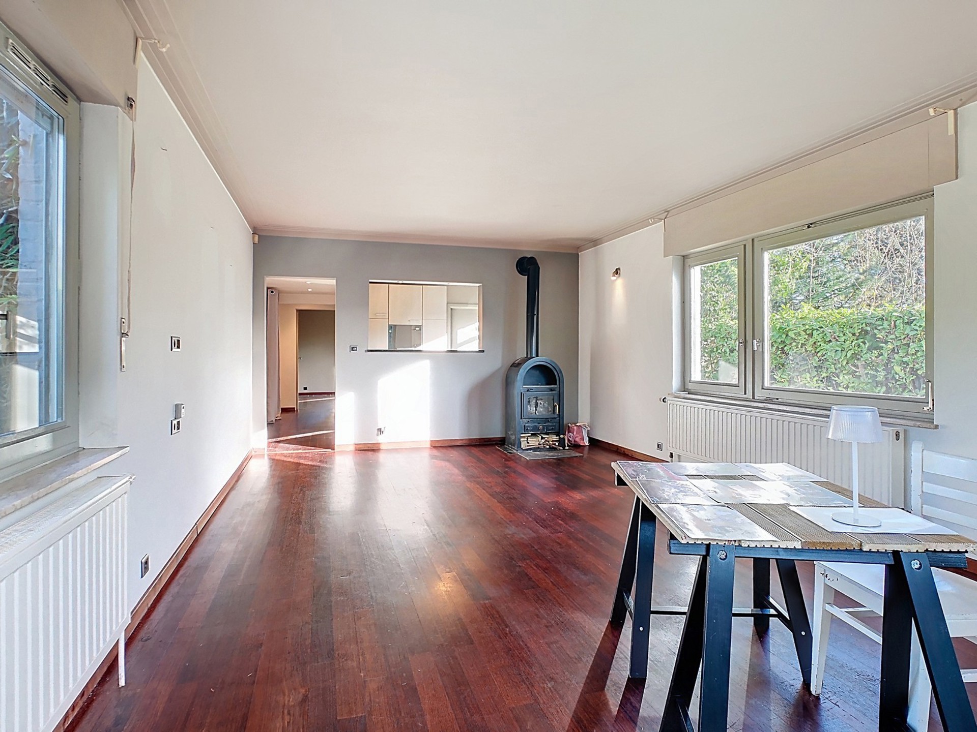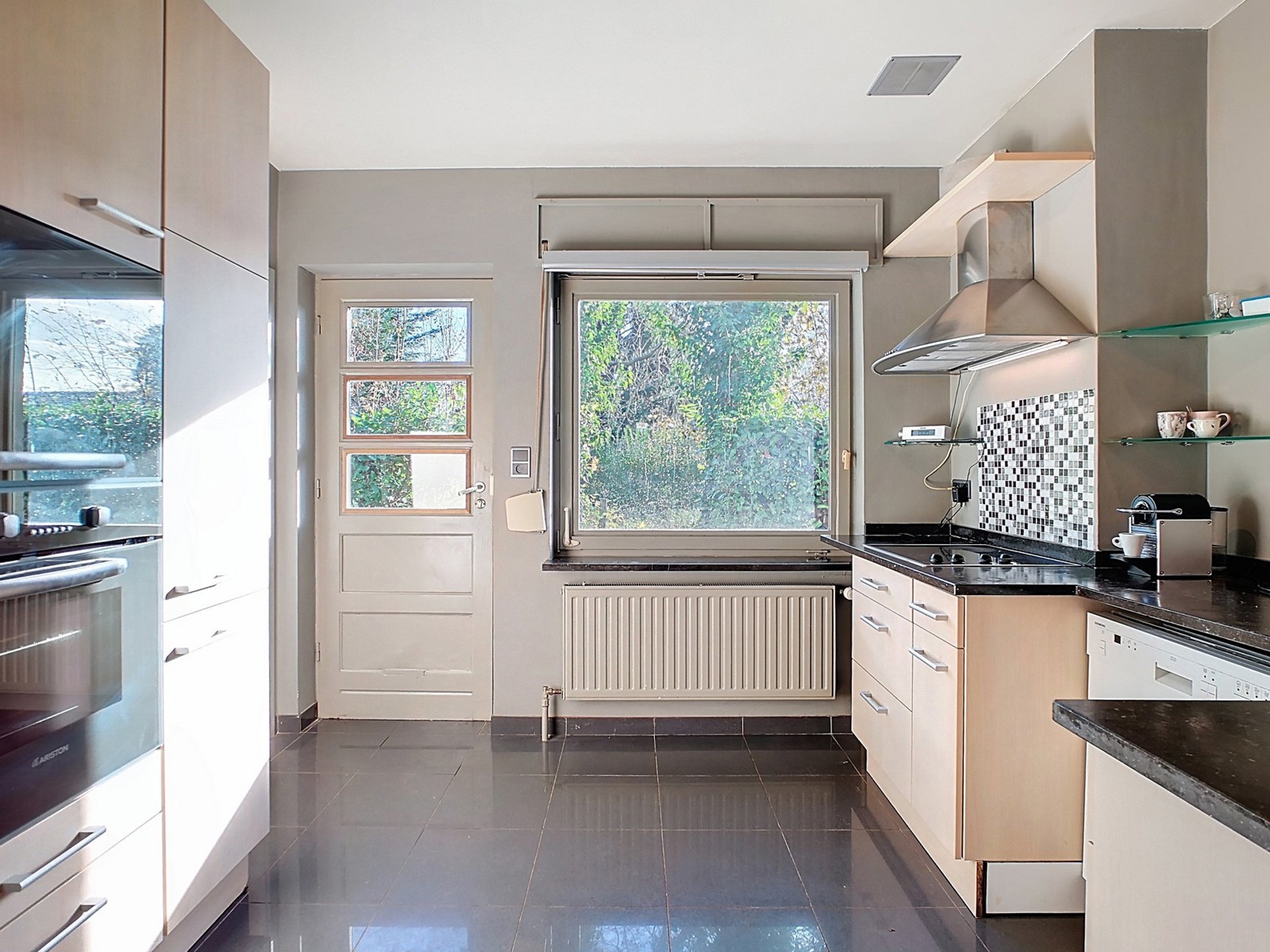 Cuisine super équipée de 9 m² (plan de travail en pierre bleue, four, frigo, taque vitrocéramique) avec coin à déjeuner / ouverture de courtoisie vers le séjour, accès vers l’extérieur et vers un grand espace de rangement de 27 m² en sous-sol.