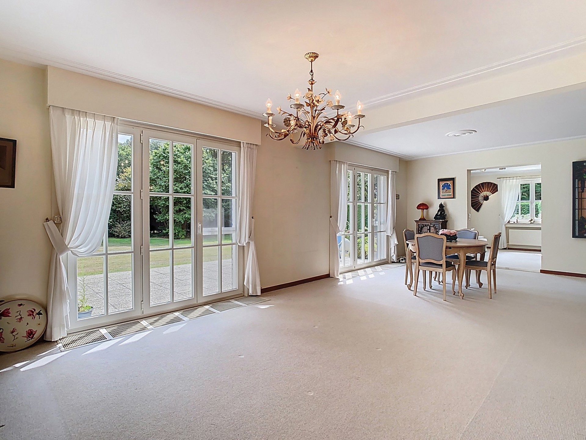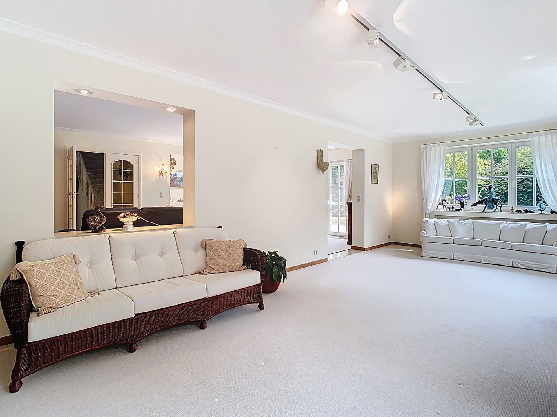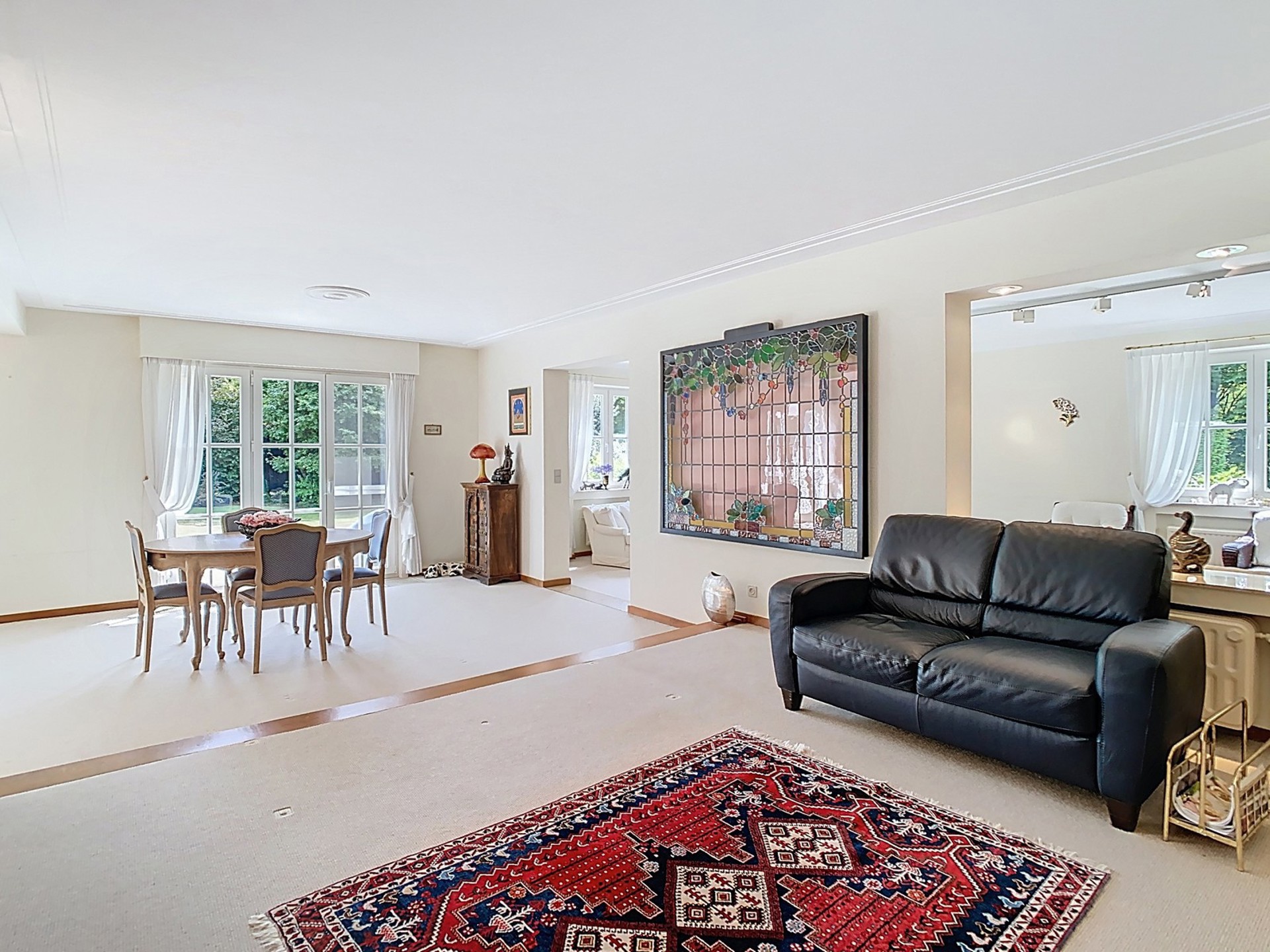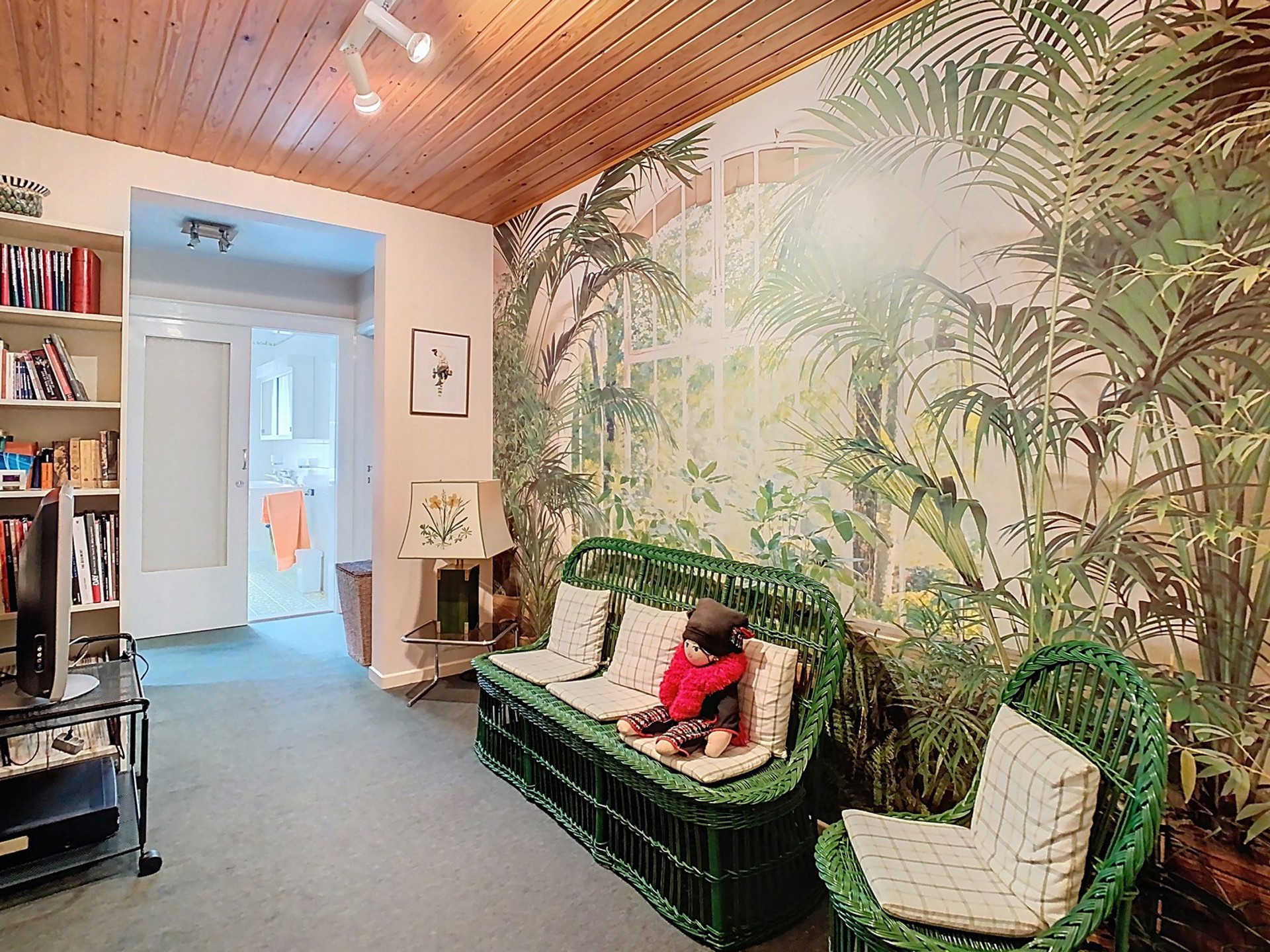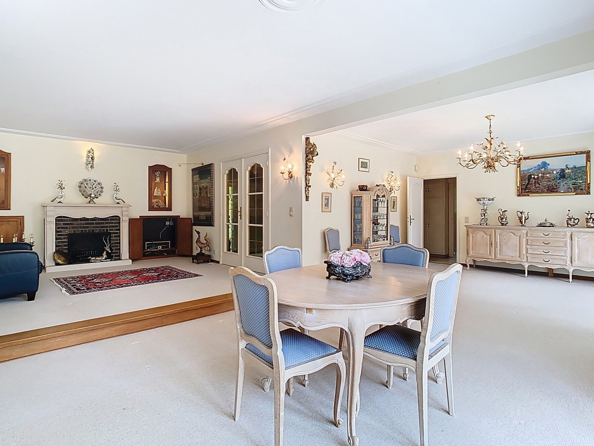 Grand living de 50 m² avec feu ouvert, accès à la terrasse et au jardin.