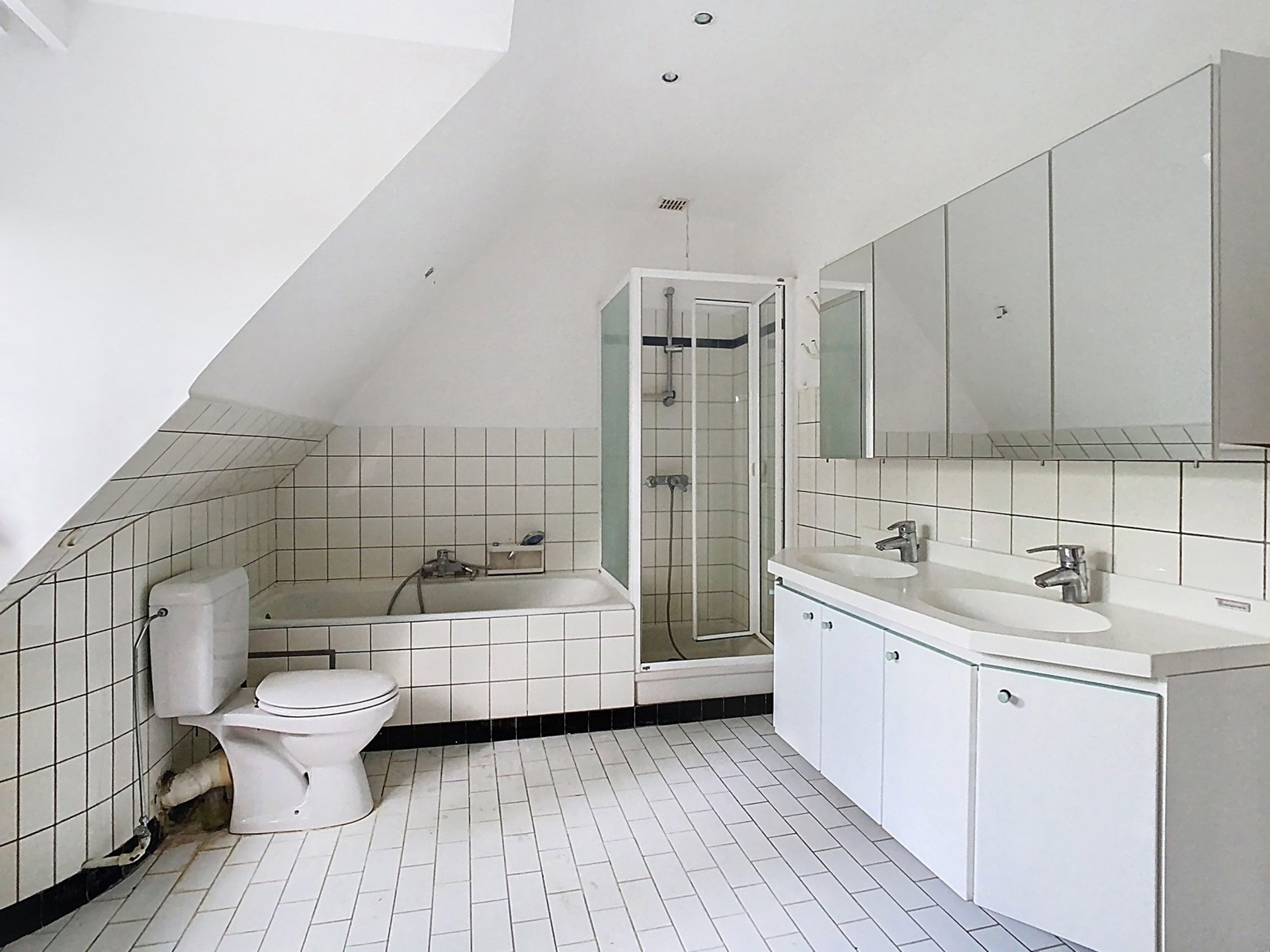 Salle de bains (meuble double lavabo, baignoire, douche et toilette).